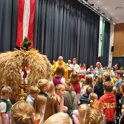 Das Erntedankfest konnte heuer aufgrund des schlechten Wetters leider nicht vor dem Momentum gefeiert werden. Der Erntedankgottesdienst fand im Momentum mit einer großen Anzahl an Gottesdienstbesuchern statt. Nach dem feierlichen Einzug mit der Erntekrone feierte Vikar Parzmair mit uns den Dankgottesdienst, der vom Marktmusikverein wunderbar musikalisch gestaltet wurde. Zur Segnung der Erntekrone durften die zahlreich anwesenden Kinder nach vorne kommen. Ein besonderer Dank gilt allen, die unsere Pfarrkirche und auch den Vorplatz so wunderschön geschmückt haben. Eine Besonderheit in unserer Pfarrkirche ist jedes Jahr der Ernteluster und die Erntekrone. In jeder Ecke der Pfarrkirche findet man liebevoll dekorierte Erntegaben, die Gott danken für seine Schöpfung.