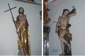 An der südlichen Außenwand sehen Sie einen frühbarocken Altar aus Aflenzer Sandstein, laut Inschrift von Georg Christoph Freiherr von Ursenbeck und seiner Frau 1619 gestiftet.